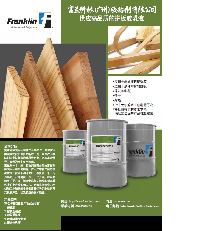 蘭科林國際公司創(chuàng)立于1935年,總部位于美國俄亥俄州哥倫布斯市,是一家專注于膠粘劑研發(fā)與制造的世界性企業(yè),產(chǎn)品遍布世界五大洲的六十多個國家。 富蘭科林(廣州)膠粘劑有限公司由富蘭科林國際公司全資擁有,位于廣東省廣州市經(jīng)濟技術(shù)開發(fā)區(qū)永和開發(fā)區(qū),總投資一千五百萬美元,占地面積一萬五千平方米,建筑面積九千平方米。擁有世界領(lǐng)先的膠粘劑生產(chǎn)設(shè)備和工藝,為家具制造業(yè)、木材加工業(yè)和建筑業(yè)提供質(zhì)量優(yōu)異的膠粘劑產(chǎn)品,以及相應(yīng)的技術(shù)服務(wù)。 |