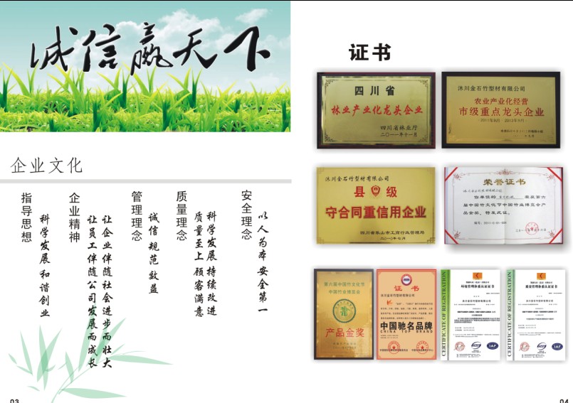 | 沐川金石竹型材有限公司地處中國(guó)二十大“竹鄉(xiāng)”之一的四川省沐川縣,是一家從事竹制品生產(chǎn)、設(shè)計(jì)、加工經(jīng)營(yíng)的國(guó)有企業(yè)。公司擁有員工400余人,占地200畝,系四川省林業(yè)產(chǎn)業(yè)化龍頭企業(yè)。 公司依托“竹鄉(xiāng)”本地豐富的竹木資源條件和當(dāng)?shù)卣拇罅Ψ龀,結(jié)合公司10萬(wàn)畝竹木基地林地建設(shè),形成了“營(yíng)林-設(shè)計(jì)-加工”一體化的經(jīng)營(yíng)模式。公司生產(chǎn)工藝先進(jìn),擁有主廠房面積40000平方米,七條成套設(shè)備流水生產(chǎn)線,主要生產(chǎn)重竹型材、集裝箱板、覆面竹編膠合板、火車廂底板、竹地板、戶外地板等。“沐源川牌”系列竹型(板)產(chǎn)品通過(guò)了ISO9001,ISO14001管理體系認(rèn)證和FSC森林認(rèn)證,其重竹地板榮獲了“第六屆中國(guó)竹文化節(jié)中國(guó)竹業(yè)博覽會(huì)產(chǎn)品金獎(jiǎng)”。高性能重竹材特別適用于高檔別墅、室內(nèi)外裝飾、工藝雕刻、仿古家具、傳統(tǒng)名俗建筑等眾多領(lǐng)域,產(chǎn)品綠色低碳、環(huán)保,深受客戶青睞。 公司堅(jiān)持以顧客為關(guān)注焦點(diǎn),堅(jiān)持以質(zhì)量為中心,與四川林業(yè)科學(xué)研究院、四川大學(xué)高分子研究所進(jìn)行合作研發(fā),配備專業(yè)的設(shè)計(jì)團(tuán)隊(duì)為客戶服務(wù)。 傳承文化,融入潮流,健康綠色,體貼溫馨是我們不斷的追求。 您的認(rèn)可就是我們的自信,您的滿意就是我們的動(dòng)力!誠(chéng)邀您的加盟! |