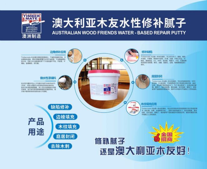 澳大利亞木友膩子中國南方區(qū)代表處地址位于廣東省中山市西區(qū)沙朗,主要負(fù)責(zé)澳洲木友水性修補膩子(TIMBERMATE)及德國進(jìn)口PNZ高端木蠟油產(chǎn)品在中國南方區(qū)域的銷售與展會推介事務(wù). 1.澳洲木友膩子產(chǎn)品簡介: